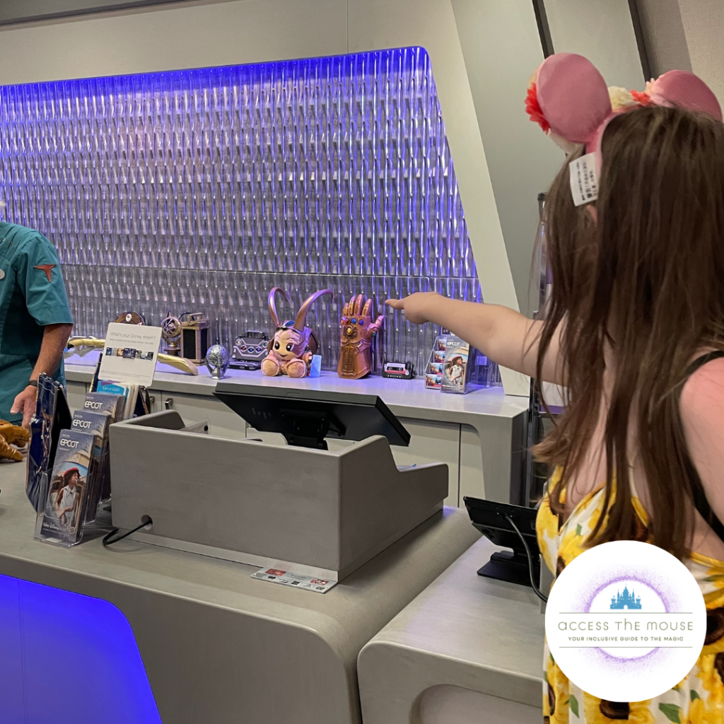 We stopped for a minute – we got a few photos with the Encanto topiary display and Spaceship Earth, I got our virtual queue reserved for Cosmic Rewind, and we discussed what we wanted to do first. The overwhelming answer we got from the kids was that they wanted to get on SOMETHING and get out of the sun. My wife and I decided to set a DAS reservation for Spaceship Earth, a favorite of mine, and we chose to wait out the queue time in Gateway Gifts.