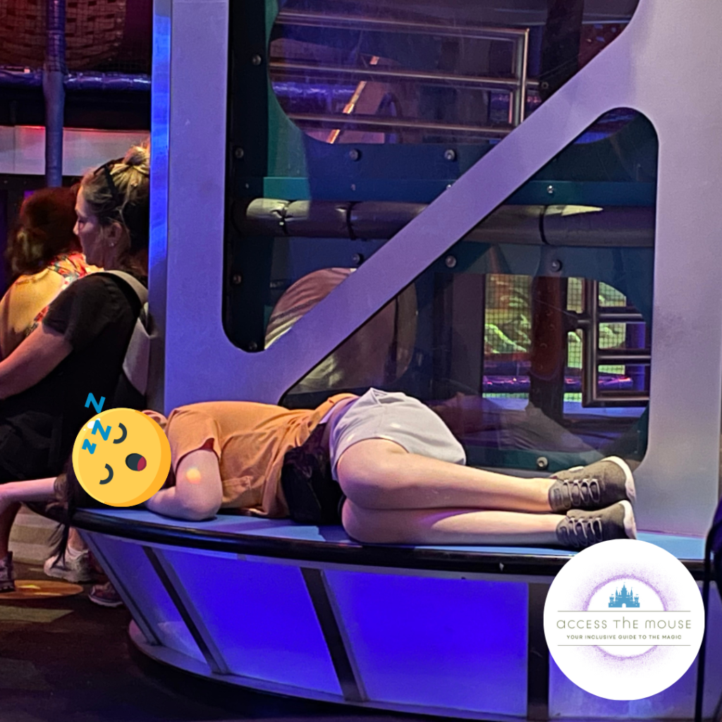 Once we finished up with Goofy, we headed back to Spaceship Earth. I made a critical error in accessing this ride. I’m not used to having my mobility device with me in the parks – my last Disney trip before this one was in 2017, and I started using my rollator in January 2020 – and I wasn’t aware of the mobility entrance to the ride. I parked my rollator next to our stroller and we went in the standard entrance, up the lightning lane ramp. Getting on the ride was no problem, but we’ll come back to this mistake. The middle kid sat with me, and absolutely loved it.