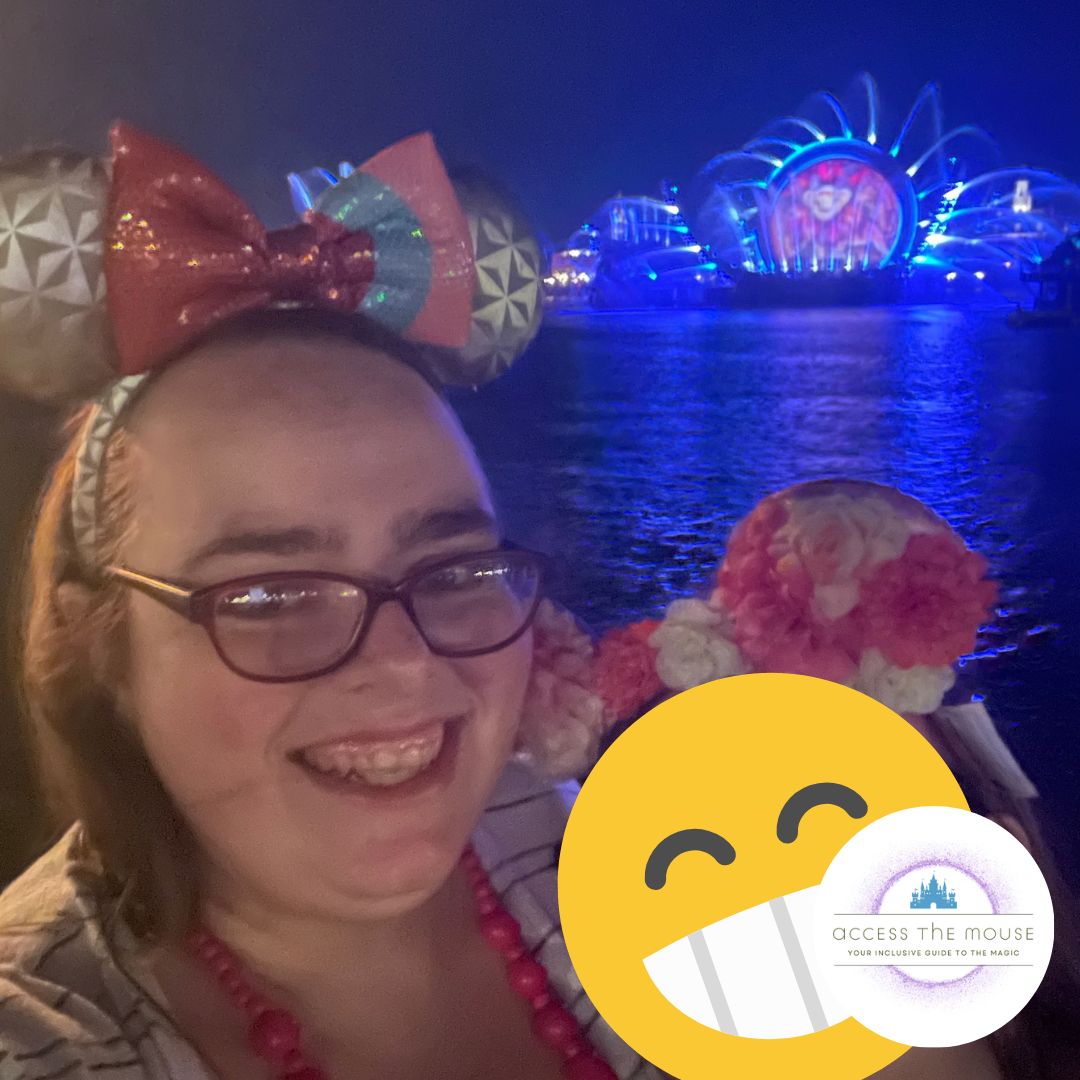 My daughter and I, on the other hand, headed to the wheelchair viewing area by Port of Entry. It was mostly full, but they allowed us to stand (and sit, in my case) near the back of the viewing area. My kid loved it. One of my favorite things about Disney is seeing her face absolutely light up at the entertainment. If my kids are with me at Disney, I’m not actually watching the castle, or the fireworks, or the projections, or whatever. I’m 100% watching the show through my kids’ faces. This kid, in particular, is in awe of the nighttime shows. She’s a big Hercules fan, and just a few hours before she was talking about how she really wished there was more Hercules representation in the parks… I kept my mouth shut, but I knew what was coming… and when the “Go the Distance” segment of Harmonious started and the recognition of what was happening hit her, it made my night.
