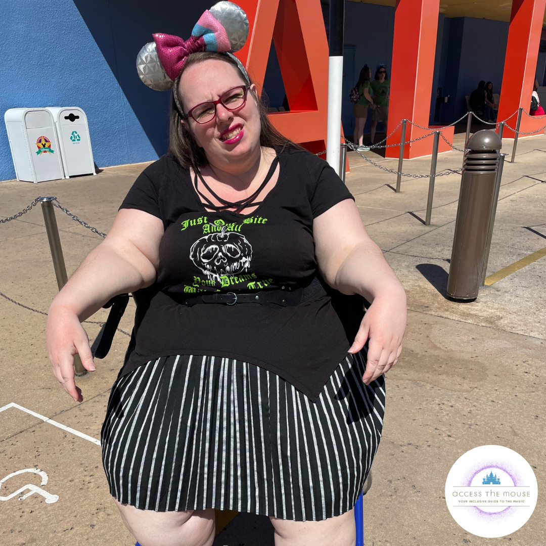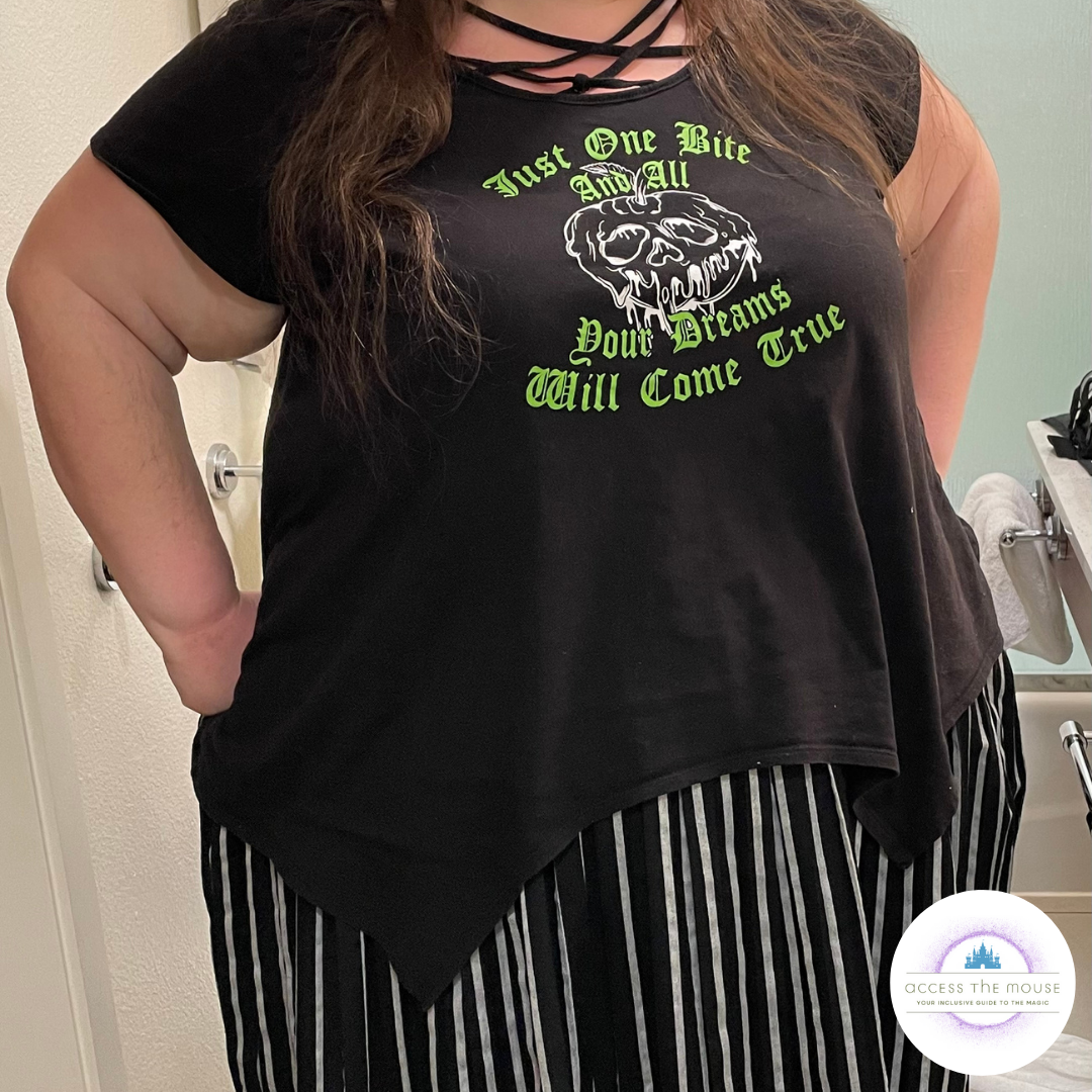 Photos: Me sitting on my rollator in the accessible line for the bus, and another photo of the shirt from the hotel bathroom. I’m wearing a black sharkbite-style shirt with a poison apple image and text that reads “Just One Bite And All Your Dreams Will Come True”
