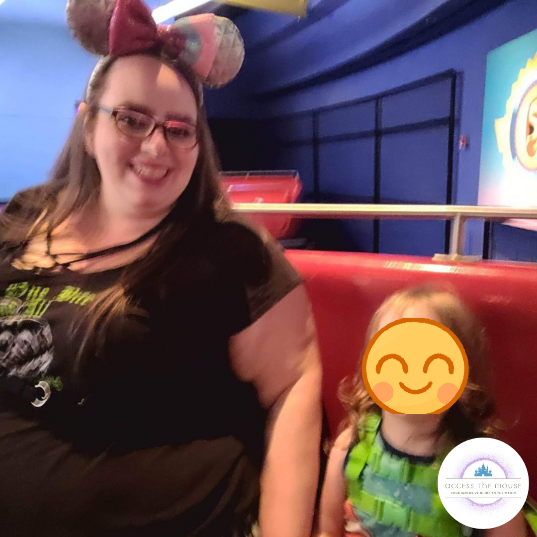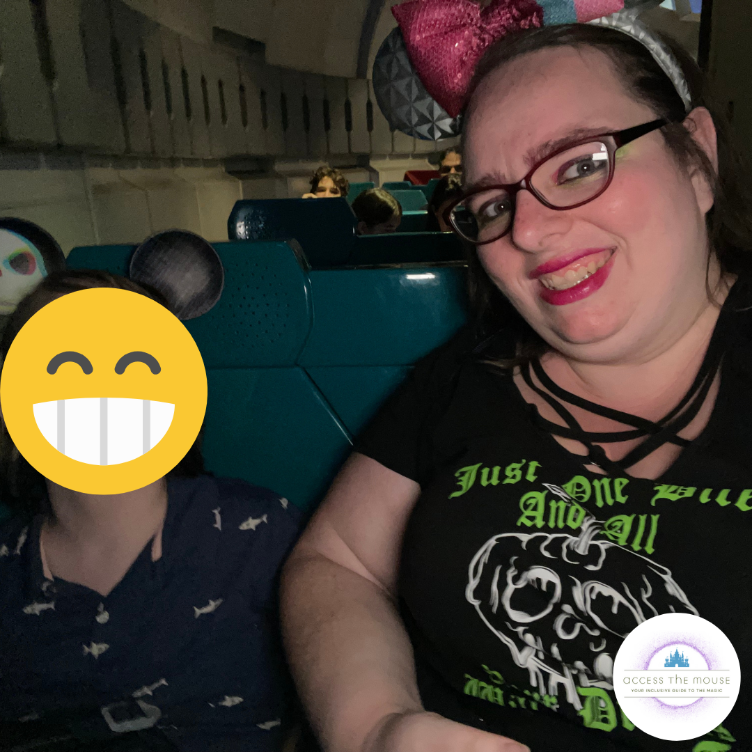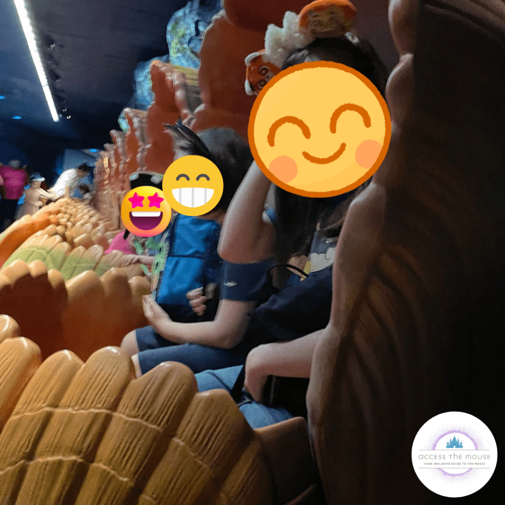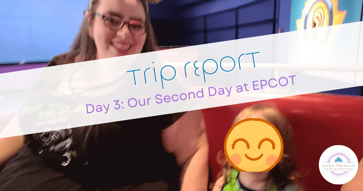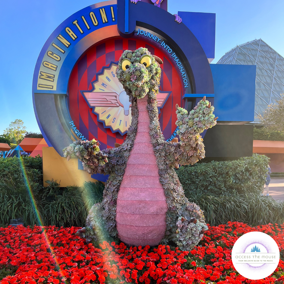 I had an issue with Soarin’ and almost couldn’t get the seatbelt to click. I struggle with seatbelts sometimes, and Soarin’ is one of the trickier ones for me. Usually, my wife is able to assist, but since she stayed behind with the youngest, I was on my own. It took me a few tries, and my middle kid helping me line up the seatbelt with the buckle (because I can’t typically see what I’m doing.) I did manage to get it to work, and we were soon up in the air. After our ride, we went back out, and my wife took them the kids through again. I stayed with the toddler, who at some point during my time on Soarin’ decided to take a bite out of my rollator’s foam. Once my wife and kids were done with their turn, we took the toddler to get changed and went over to ride Journey into Imagination Figment via the standby queue.