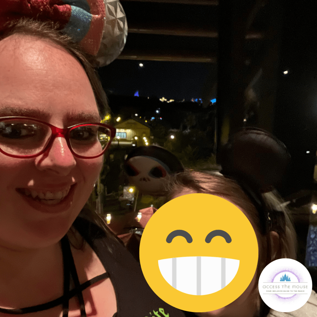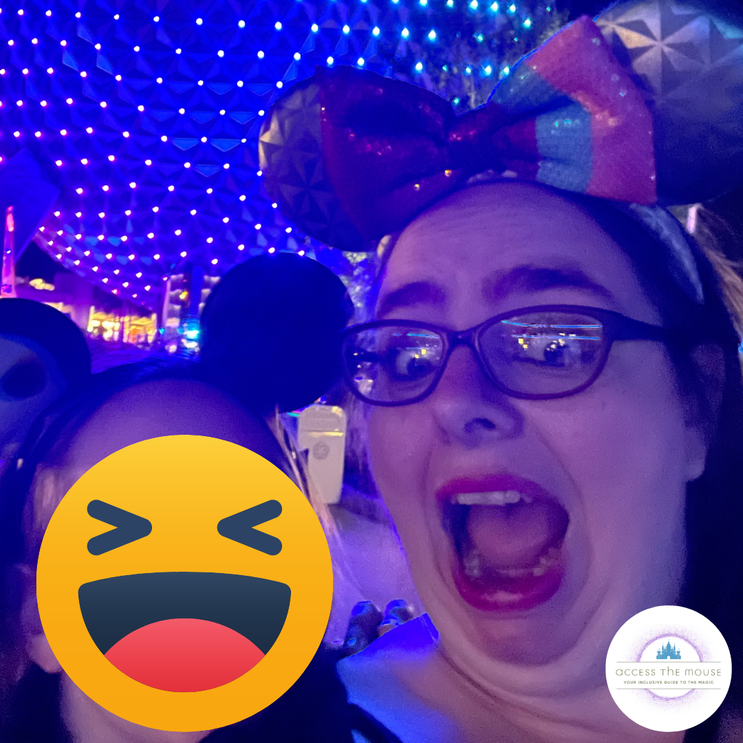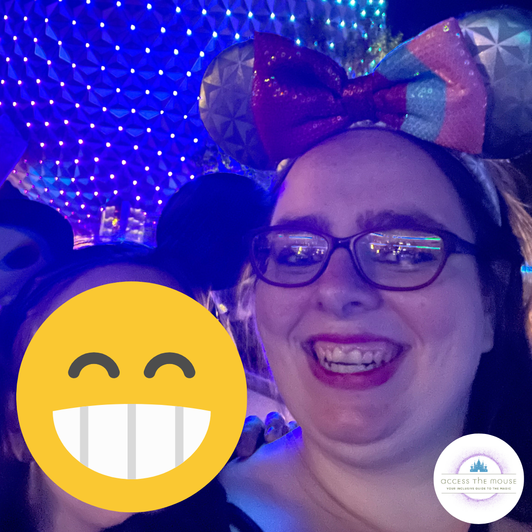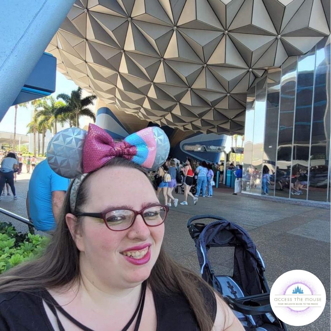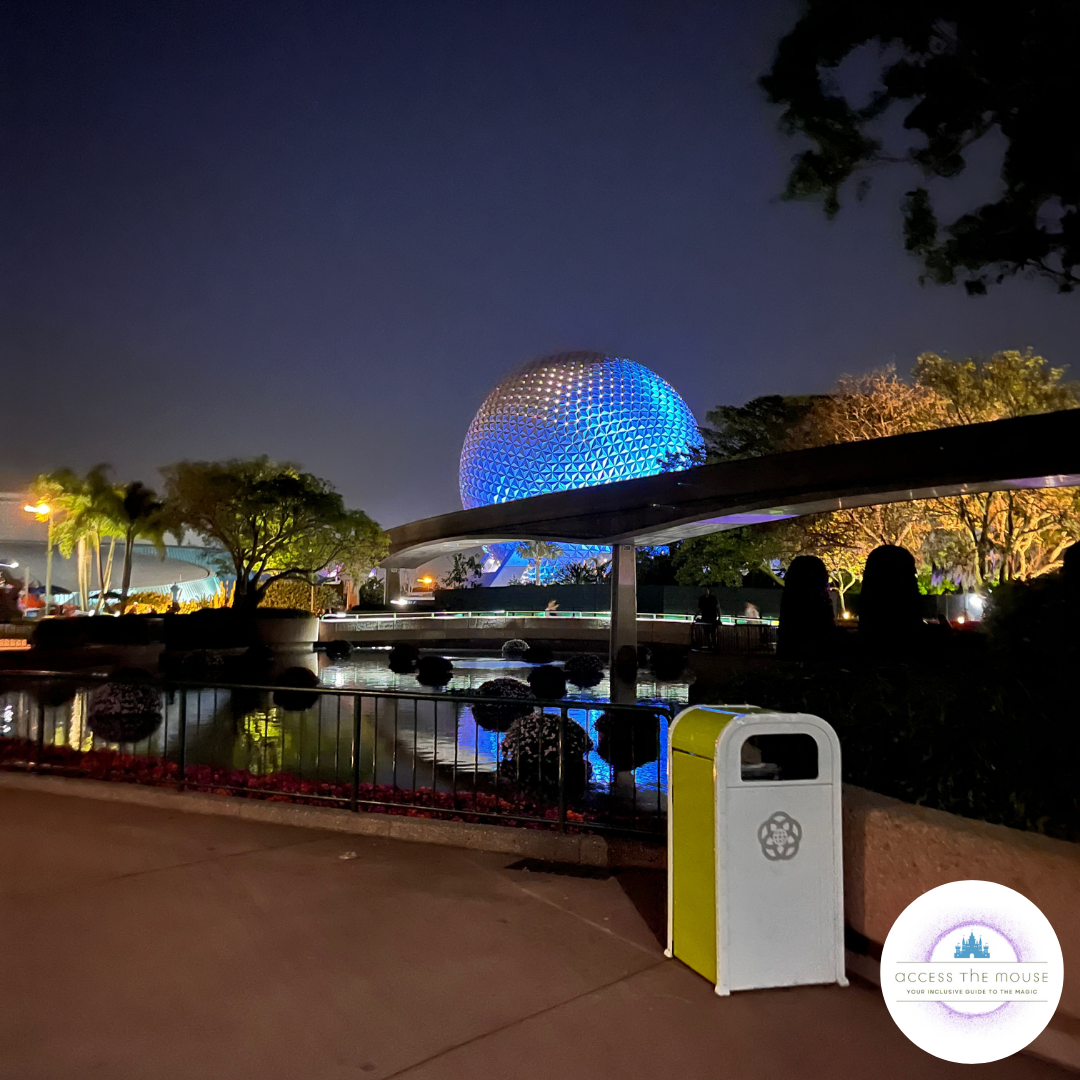 We stopped for another quick photo and I asked a cast member about how to access the ride without leaving my rollator way up at the front in stroller parking again. Turns out there’s an accessible back entrance inside Project Tomorrow for guests with mobility devices. When you face Spaceship Earth from the park entrance, you walk past the queue, and find the door with the wheelchair marking on the left side of the building. You enter Project Tomorrow there, wait a few minutes, and the cast members escort a group onto the ride via the exit. We were on Spaceship Earth just before 1:00 pm. While we were on the ride, I got our Guardians of the Galaxy: Cosmic Rewind time reserved, and we set up DAS returns for The Seas with Nemo and Friends.