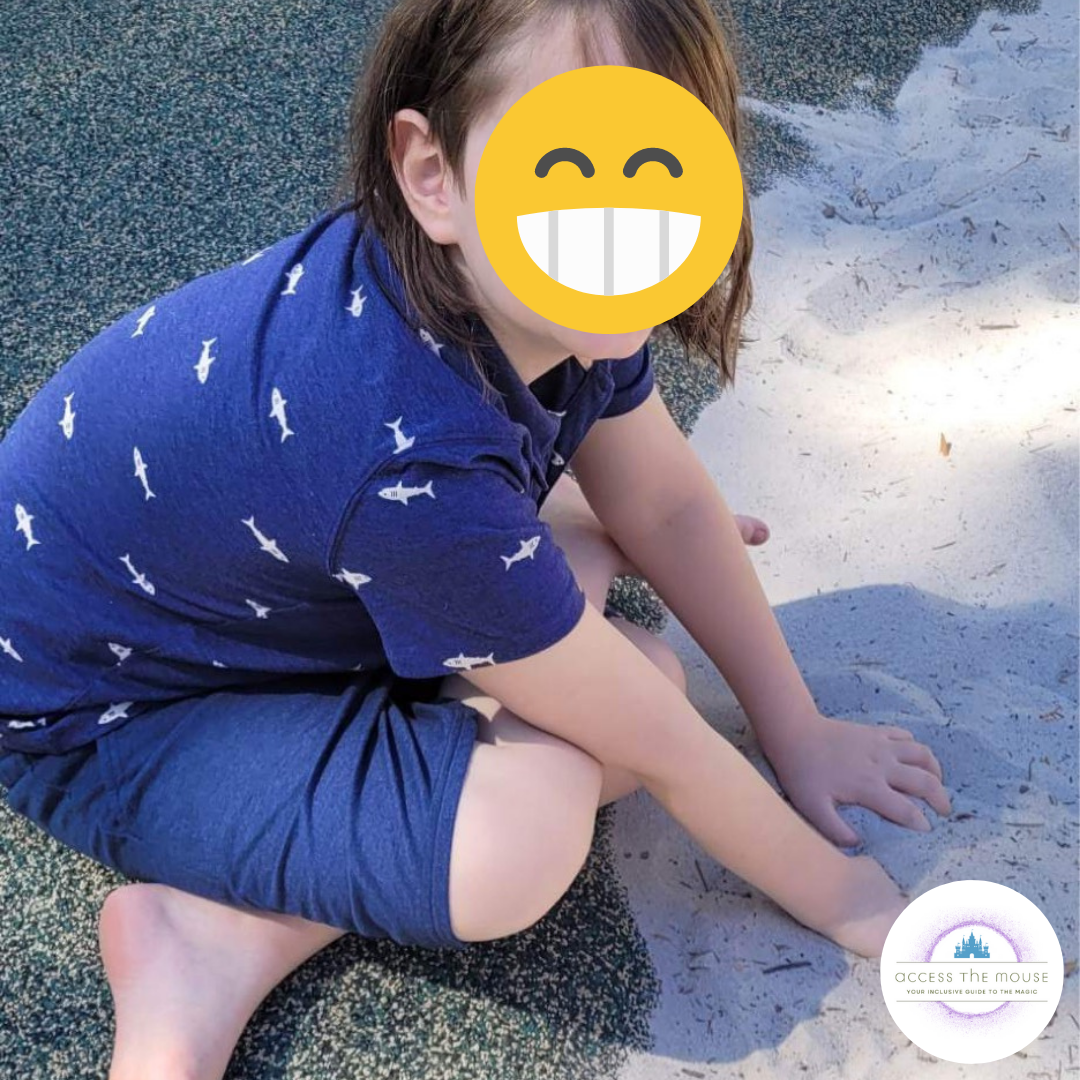 Photos: the middle kid with his hands in the sand, two photos of the younger two kids climbing at the playground, the toddler singing on the bus. All photos have emojis covering kids faces for privacy reasons.