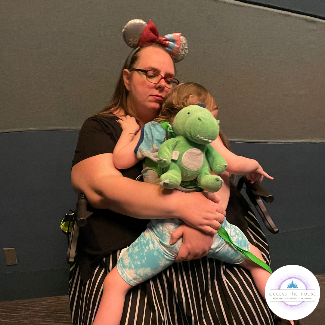 We left the stroller with the others, and my toddler held onto one of the handles of my rollator as we walked in. Turtle Talk has a separate waiting area for guests with mobility needs, because they enter before the crowd from the regular waiting area does. Wheelchairs and other mobility aids have seating at the ends of the rows. There are two levels of benches that are also available, so guests who have a harder time getting off the low benches at the front can sit in the back.