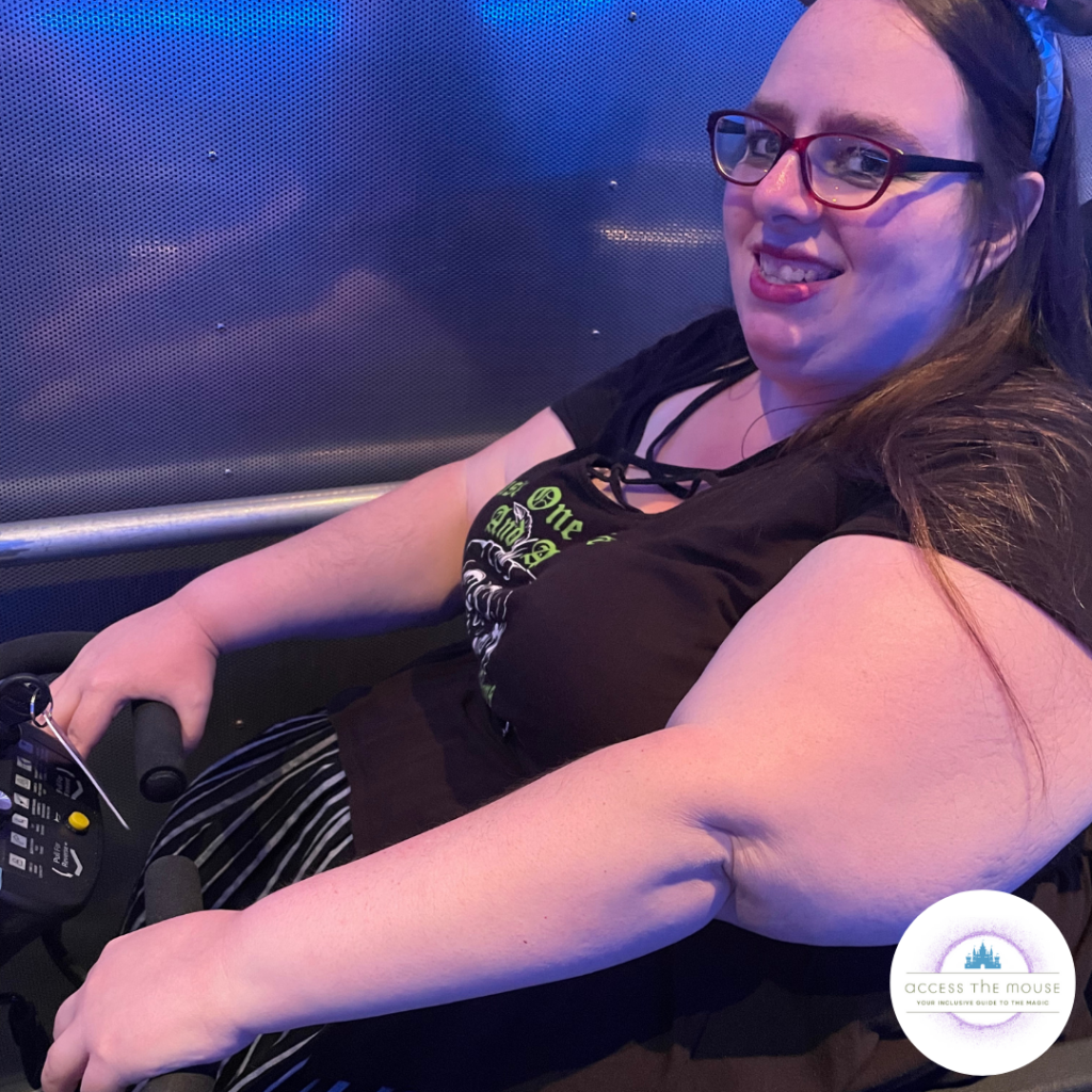 When we were finishing up eating, my wife got a text that there was a scooter available, and she needed to head over to pick it up. We took a minute to figure out whether we were going to keep the rollator with us or have it stored at the ECV rental. My thought process was that there may be some rides that an ECV couldn’t go through the queue, and I didn’t want to not have the option of transferring to my rollator, knowing that the wheelchairs provided by the park for transfers only hold up to 300 lb. She then headed up to the entrance to grab the ECV.