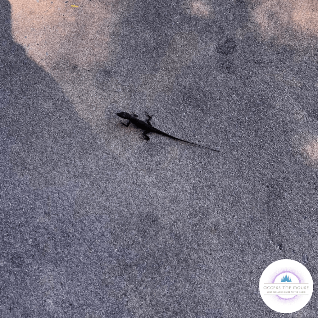 While we were in Turtle Talk, a lizard leapt onto the middle kid’s face. When it got knocked down, it decided to be extra friendly, jump back up onto him, run across, climb my wife, jump onto the stroller, and then scurry away. After it was off of everyone and our things, the kiddo took photos and video of it (and another video of a squirrel) while waiting for us.