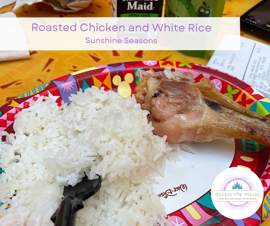 I’m not going to do a full post about Sunshine Seasons’ allergy offerings as part of my trip review posts. There was one option on the allergy menu that was listed as safe for me – the chicken leg with white rice kids’ meal. I really needed to just quickly get some food into my system and take my medication, and the restaurant was closing within the next ten minutes, so I decided to go with that as the path of least resistance. We got everyone’s food, and sat down to eat. Honestly, my food wasn’t anything to write home about, but it did the job.