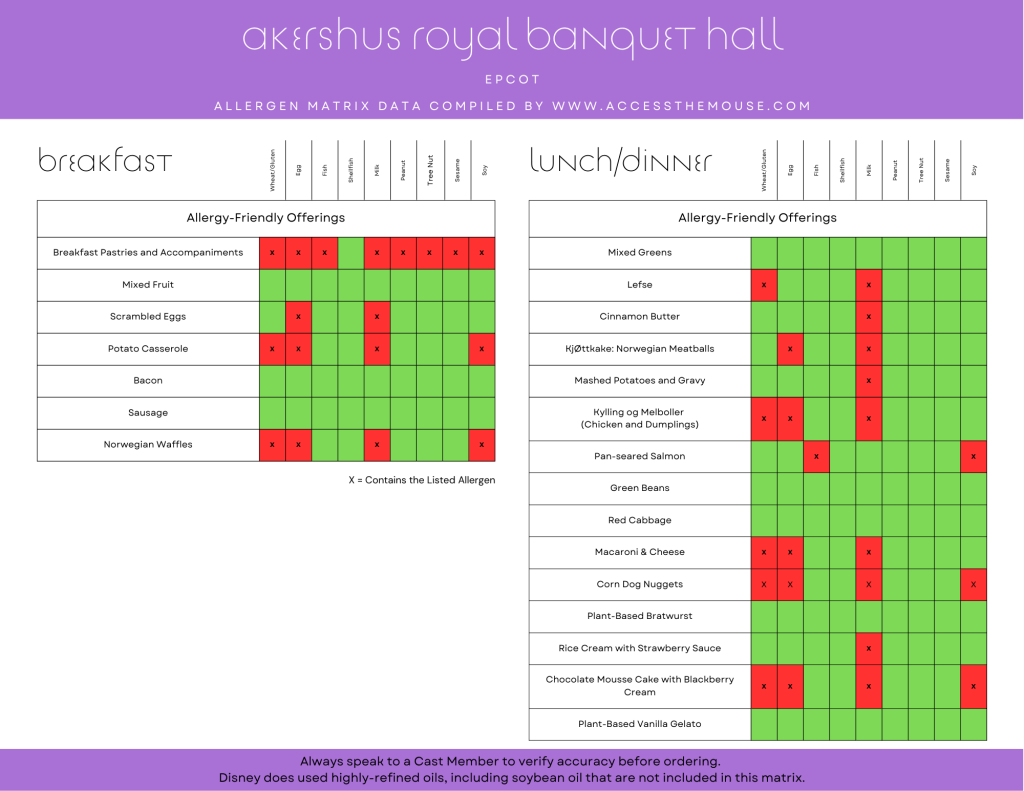When COVID-19 led to the closure of Disney Parks around the world, it took a while for Akershus to re-open their doors. Finally, on November 4, 2022, the dinner character dining experience came back, and now it was recently announced that the restaurant will be bringing back breakfast and lunch seatings on May 14, in just a little over two weeks. The lunch and dinner seatings share the same menu, while breakfast take a menu of it’s own. I’ll be sharing allergy-friendly items and matrices for both menus below.