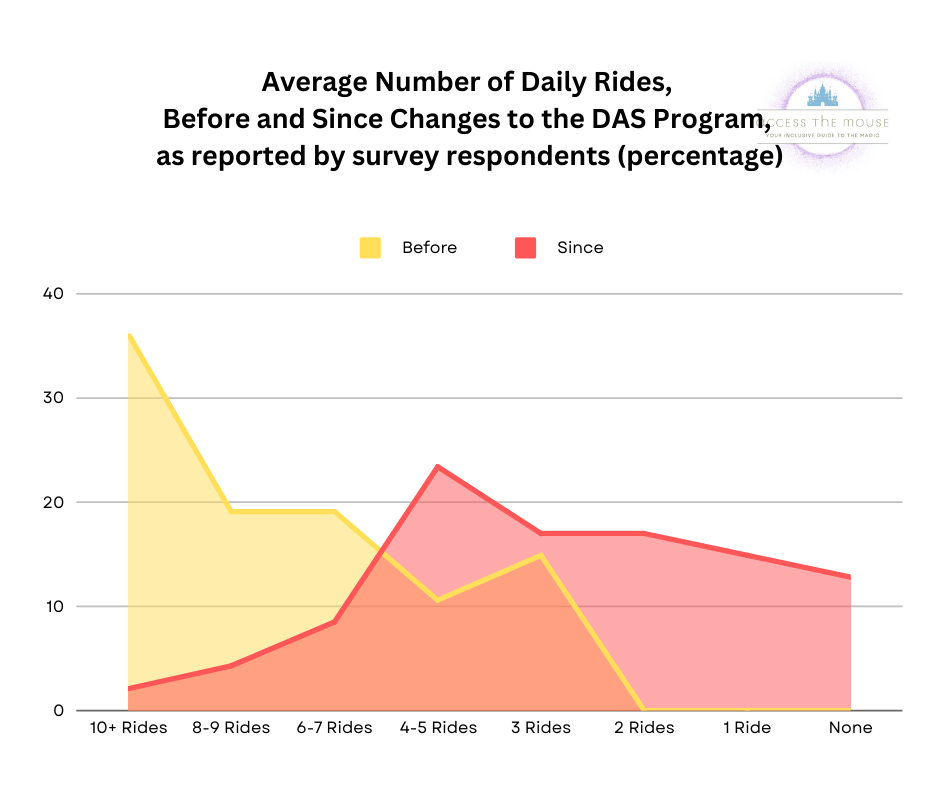 Since the DAS changes, the number of respondents who indicated that they were able to ride four or more rides on this visit dropped to 38%, with just 2% indicating ten or more rides. 17% indicated that the were able to ride an average of 3 rides per day on their current visit, and 32% indicated that they were only able to ride 1-2 rides per day. Notably, 13% of respondents indicated “I wasn’t able to experience any rides I had hoped to.”