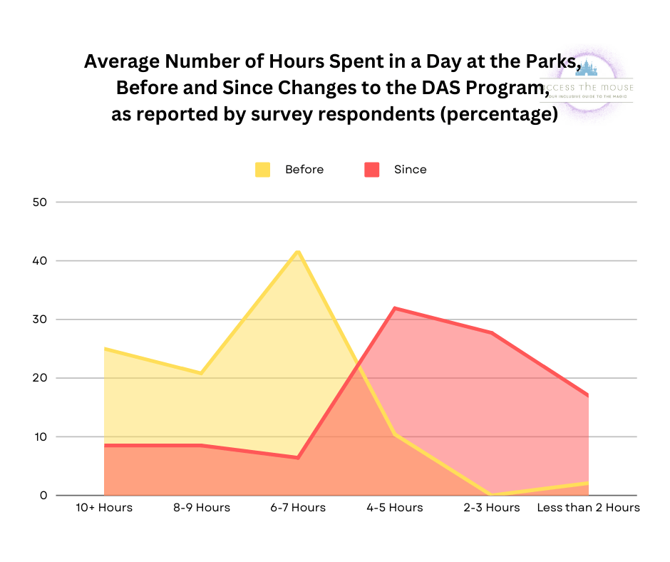 88% of respondents indicated that before the DAS changes, they were able to spend 6 or more hours in the parks, with the highest indication for 6-7 hours on an average day. Since the DAS program changed, the number of respondents who indicated that they were able to spend 6 or more hours in the parks dropped to 24%. 32% of respondents indicated that the averaged 4-5 hours a day on their most recent visit, while 45% only managed to spend 3 hours or less in the parks each day.