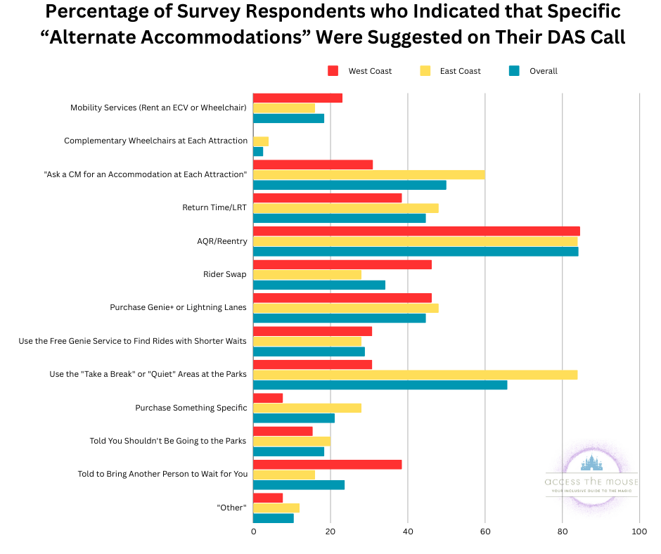 On the East Coast, most respondents indicated that they were told to use the “Take a Break” or “Quiet” areas at the parks (84%, tied with the Attraction Queue Re-Entry, compared to 31% on the West Coast.) There was also a significantly higher number of indications for “Ask a CM for an Accommodation at Each Attraction” (60% East Coast, 31% West Coast), and recommendations to “purchase something specific” that did not include Genie+ or Lightning Lanes. (28% East Coast, 8% West Coast)